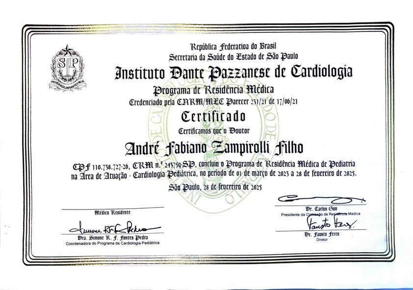 Sou médico Pediatra especialista em Cardiologia Pediátrica, com subespecialidade realizada no Instituto de Cardiologia Dante Pazzanese, instituição de excelência e referência na cardiologia brasileira. Realizei também complementação especializada em Arritmologia/Eletrofisiologia Pediátrica e em Cardiopatias Congênitas do Adulto pelo InCor-USP, centro de referência nacional e internacional.